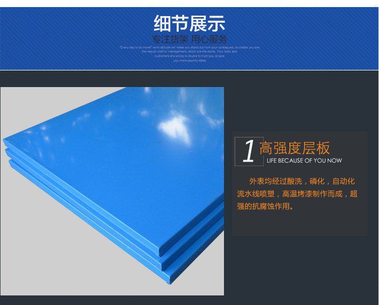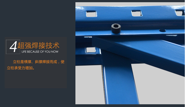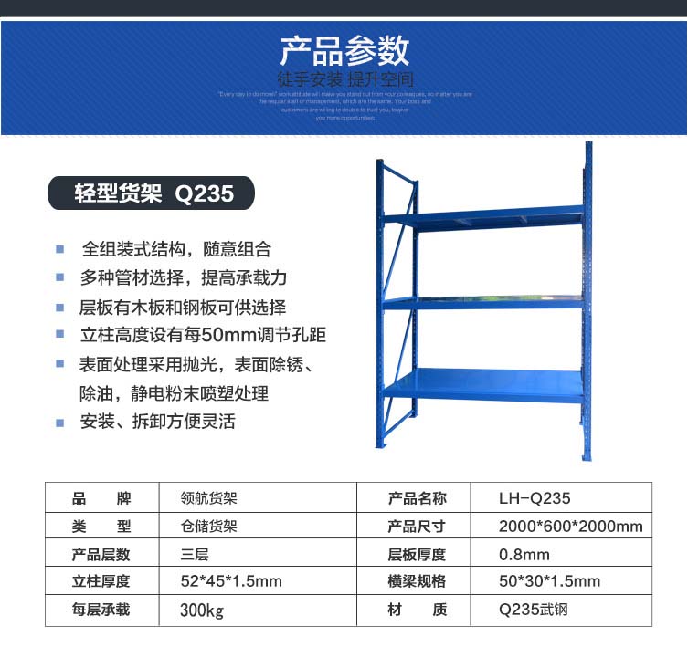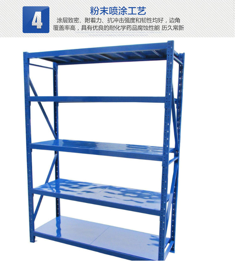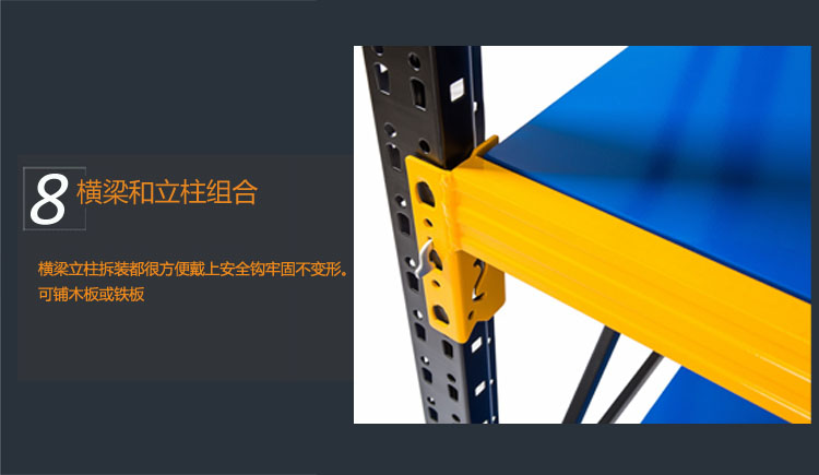 由立柱,橫梁,層板組裝而成的,結(jié)構(gòu)簡(jiǎn)單,每層層板最大載重可達(dá)300kg,層高50mm任意調(diào)節(jié),不用螺栓拼裝而成,安裝拆卸方便,且可無(wú)限連接。