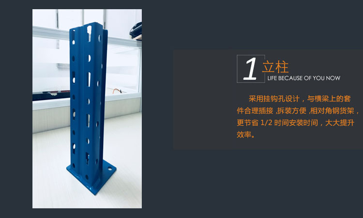 4、立柱設(shè)有每75mm調(diào)節(jié)孔距,可根據(jù)貨物高低任意調(diào)節(jié)。